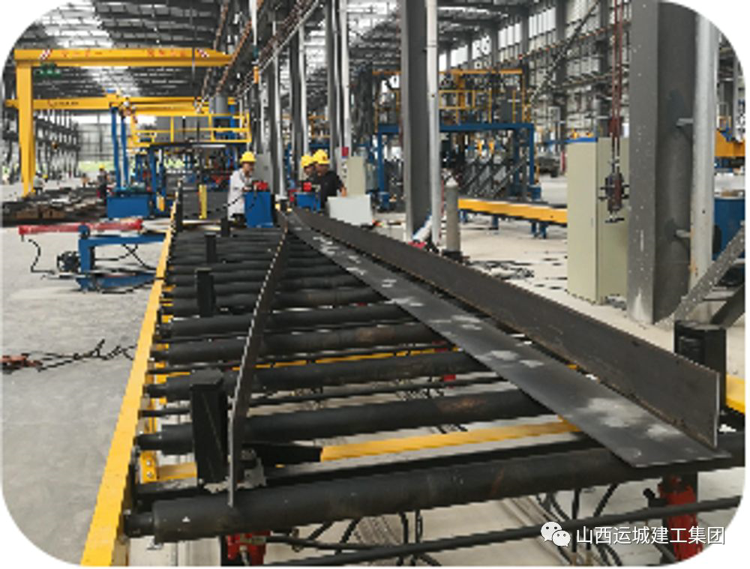 切割好的板材通過(guò)組立機(jī)兩端點(diǎn)焊初步成型為H型鋼,由輥軸輸送準(zhǔn)備進(jìn)入下道工序---組焊。