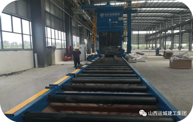 通過(guò)行車(chē)及地坪車(chē)運(yùn)輸來(lái)已矯正好的H型鋼,吊放在傳送輥軸上送入拋丸機(jī),由拋丸機(jī)噴射鉛丸對(duì)H型鋼進(jìn)行全面除銹,除銹后H型鋼由行車(chē)吊裝至下一個(gè)生產(chǎn)工序---噴涂。